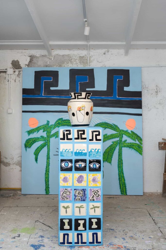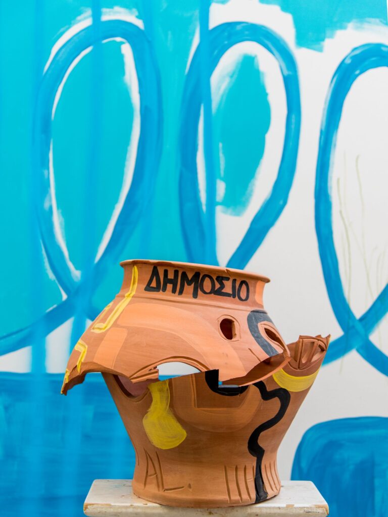 “I love the texture of ceramics as a canvas – how alive it feels,” she says. “I let the brush lead me, following its path along the curves of a vase.” Her works are playful yet introspective, often inscribed with bold words like “Public Office,” “Protocol Number,” or “Patent” – small personal snapshots of her experience adapting to life in Greece.