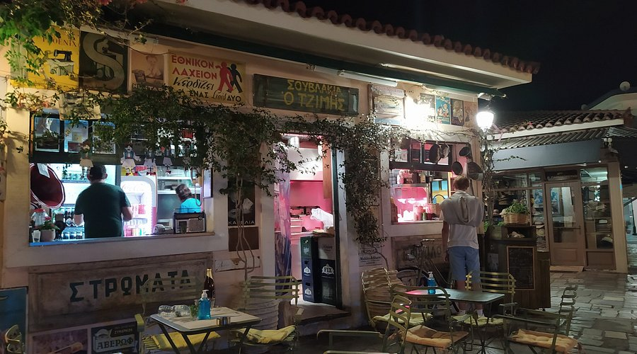 The space is modest, a little more than two windows and a counter, but as the sun sets the square fills with people carrying paper-wrapped skewers and pita gyros. Instead of tables, diners perch on the low stone ledges around the church, on top of “koureloudes” (traditional colorful woven cloths). The result is a communal picnic atmosphere that feels spontaneous, festive, and deeply local.