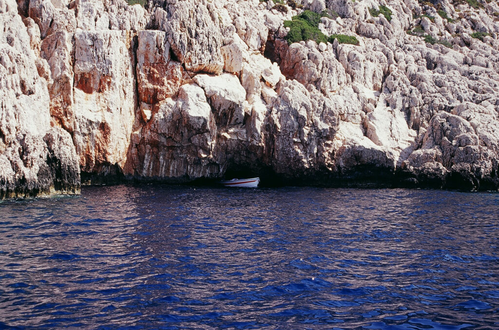 A short boat ride away lies one of Kastellorizo’s most mesmerizing wonders: the Blue Cave. Inside, sunlight filters through the entrance and reflects on the turquoise seabed, flooding the cavern with an ethereal electric-blue glow.