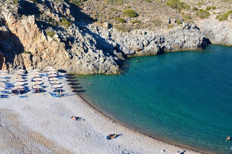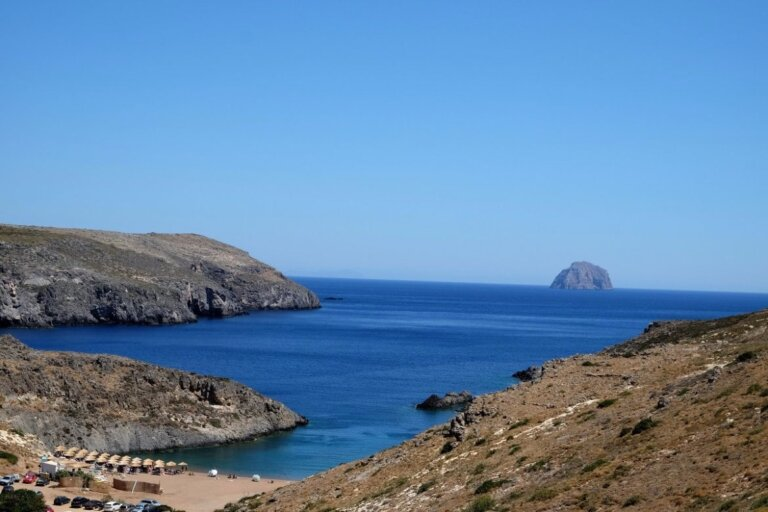 First stop: Melidoni. Me, my book, and my camera. A small bay with an organized beach—but peaceful. Fine sand, crystal waters, and a view toward Chytra rock. There’s a beach canteen that hosts parties day and night. An alternative way to get there? Hop aboard Captain Spyros’ boat from the little port of Kapsali.