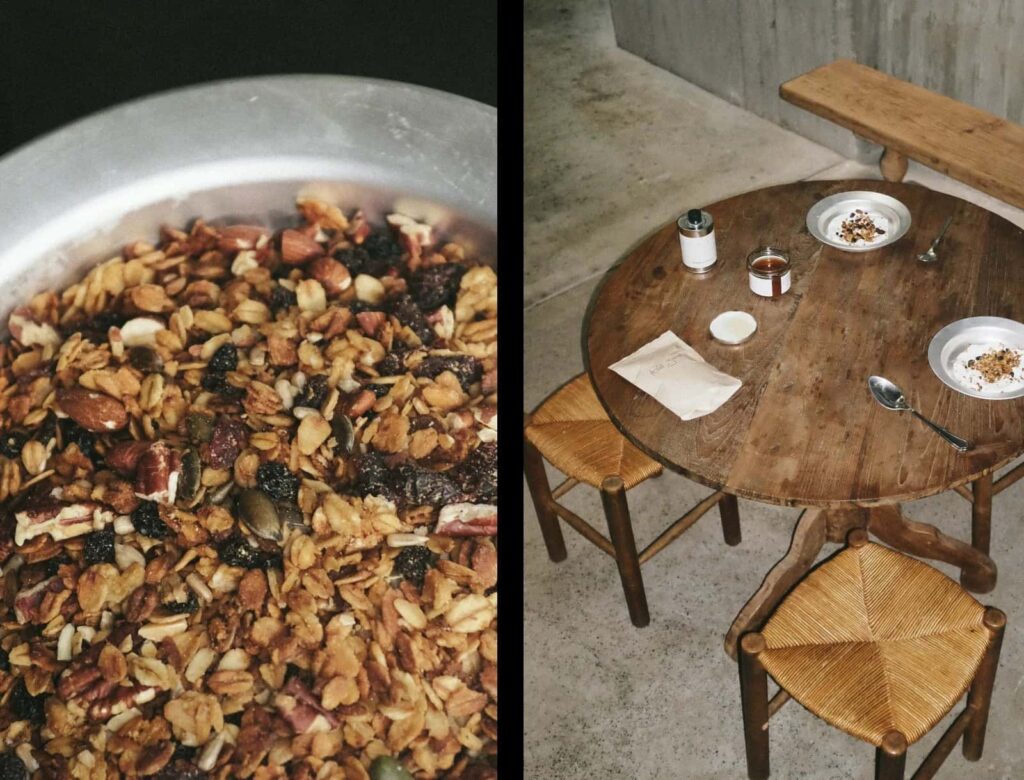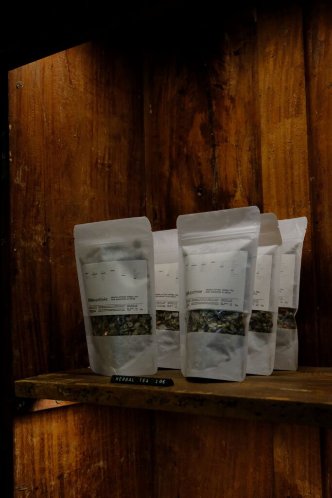 The Apotheke is not just a place you can visit—it is open only on Saturdays. Not to generate exclusivity, but to preserve a sense of ritual and rhythm. Saturdays become a gentle ceremony, inviting visitors to pause, reflect, and reconnect—with themselves, with others, and with the space around them. There is no fixed program, no pressure to consume—just presence. Visitors can drink coffee, taste herbal blends, sample products, enjoy fresh bread and hilopites (traditional Greek pasta), watch a 40-minute film installation, engage in quiet conversation, or simply sit and take it all in. “I wanted people to live it. Not just walk in, buy something, and leave. Like when you go somewhere once a week to reconnect – that’s what I envisioned here.”