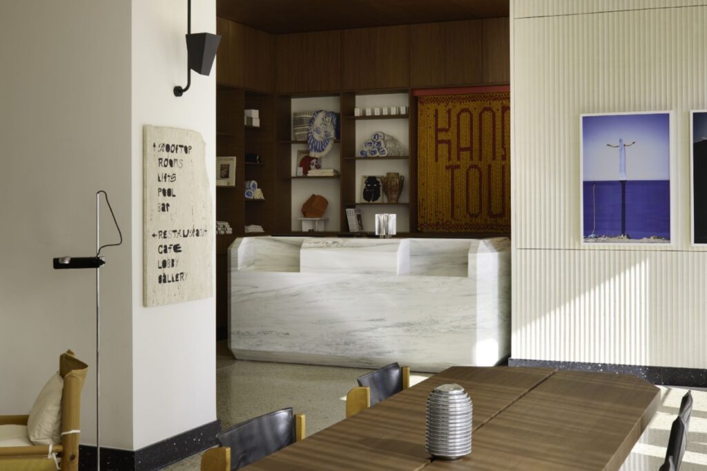 Ace Hotel has 120 rooms and its design is influenced by Greek modernism, naturalism and the charm of 1970s seaside resorts. Something that is immediately apparent even before you enter the space. Combining structural and aesthetic elements from two different architectural movements, Brutalist aesthetics and Japanese Metabolism, the dynamic image of the façade exudes an air of renewal on solid foundations that resist time.