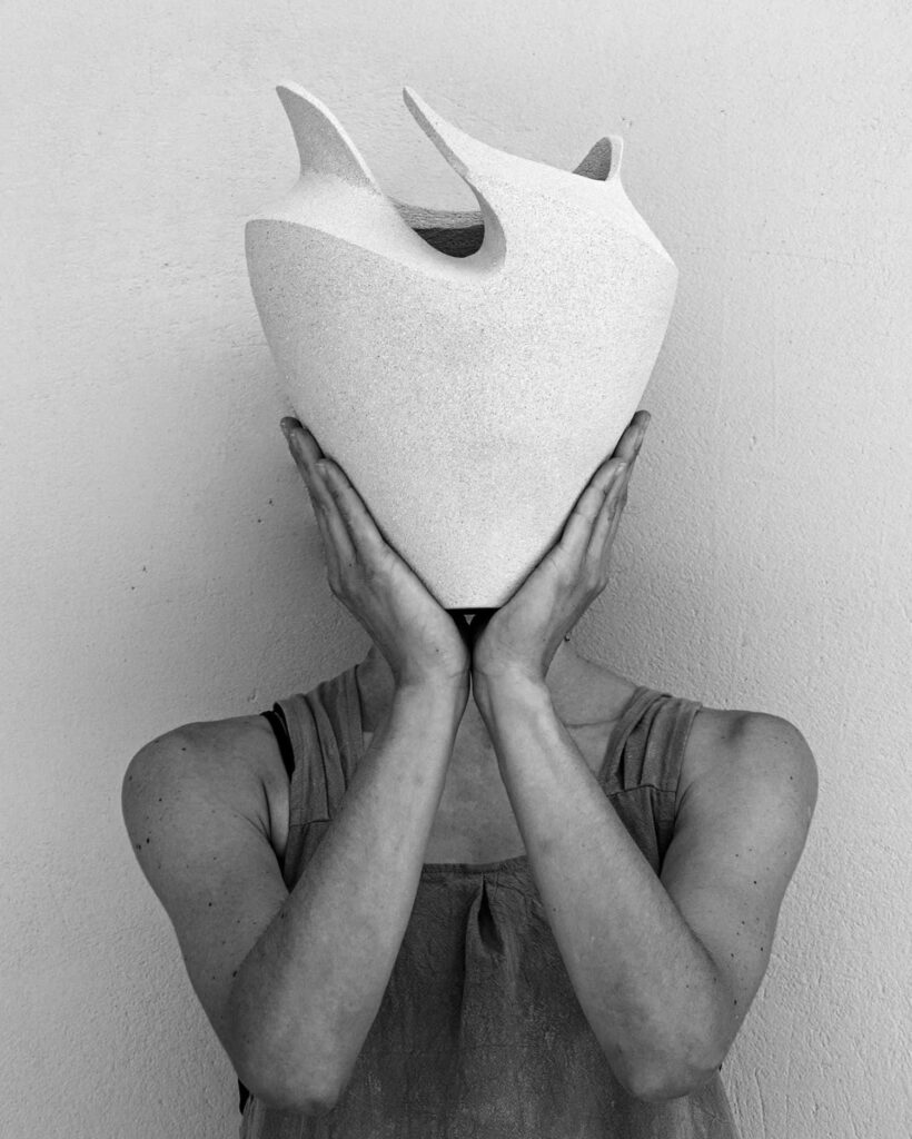 The process demands experimentation and patience. Color is not decorative but part of the sculpture’s internal tension. Luminous, earthy surfaces seem to emerge from within, as if something is being born. Many of their recent works resemble shells or protective structures, forms that appear to carry an inner life.