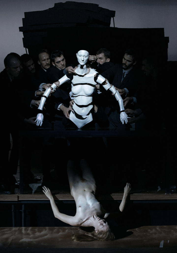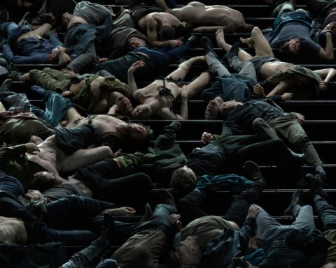 The beginning: a clothed body stands before us, striking the wooden floor until it splinters. From that act of violence, another body – naked – emerges, and the two intertwine: the modern mind and the primal nature. The unearthing – civilization uncovering the archetype. Then, a figure reminiscent of a caryatid balances a tray of stemmed glasses upon her head. Papaioannou’s hybrid creatures fill the stage; his chimeras move toward the abyss, performing poetic images that play out before our eyes. “The landscape is the human being,” and the human carries the dry stone wall that is being built upon him. “He is a Sisyphus holding his fragments together,” Papaioannou writes in the accompanying publication.