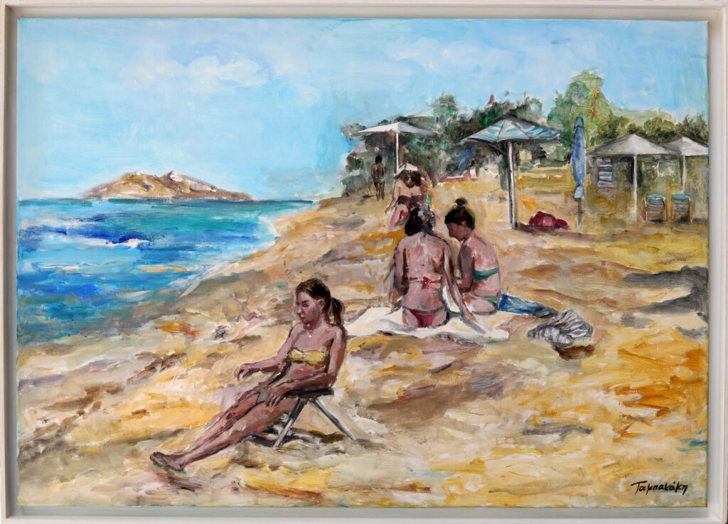 Pela Tampakaki’s work is distinguished by her expressive brushwork and vivid use of color, which transport viewers into idyllic beachscapes filled with life and light. Her paintings evoke a sense of nostalgia and freedom, inviting the audience to immerse themselves in the warmth and tranquility of summer days. Each piece reflects Tampakaki’s keen observation of human interactions with nature, beautifully illustrating the timeless bond between people and the sea.