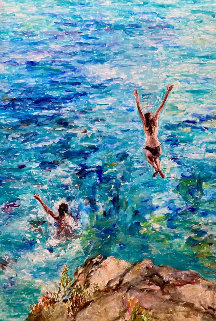 From children playing by the shore to quiet reflections of individuals enjoying the water, her paintings offer a celebration of leisure and the simple pleasures of life.