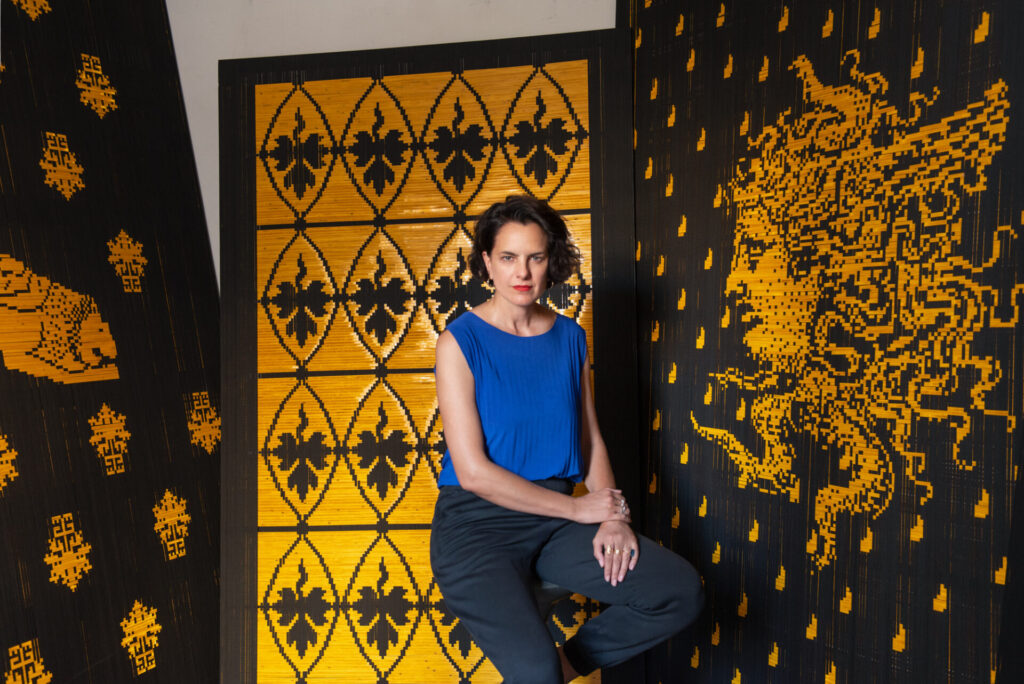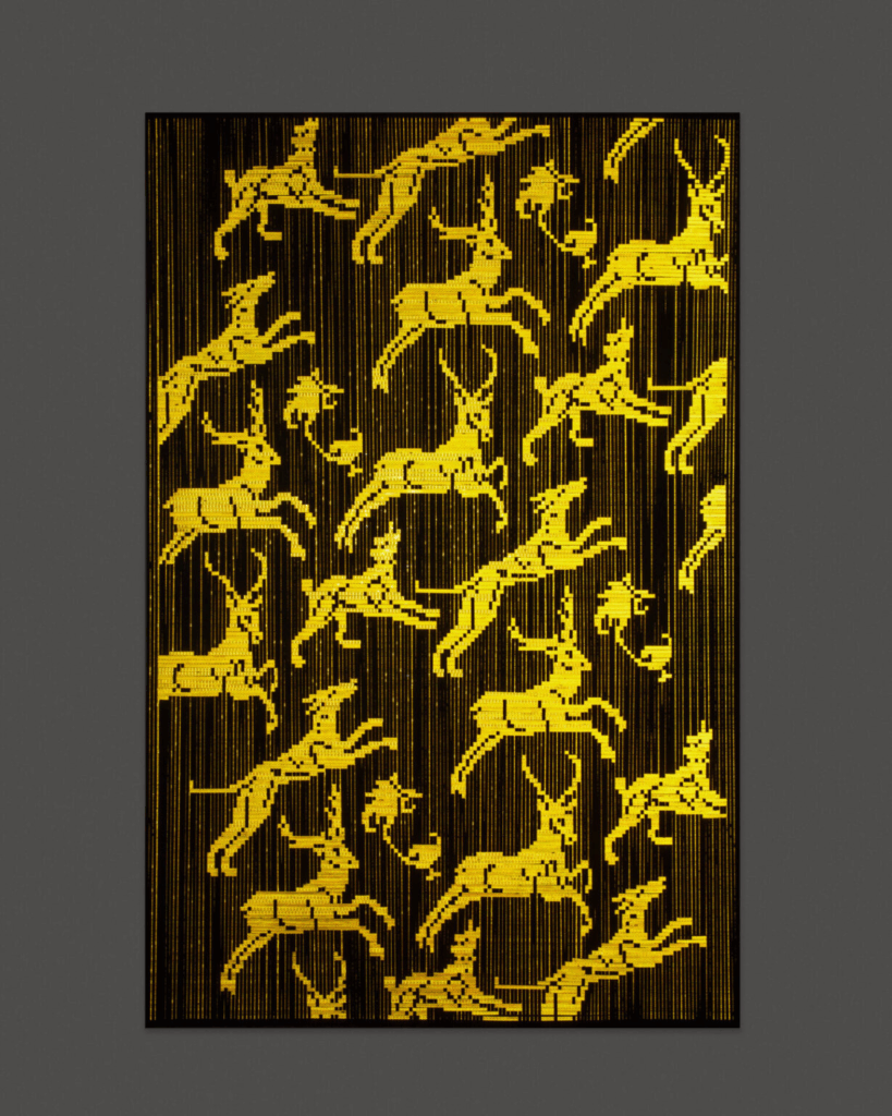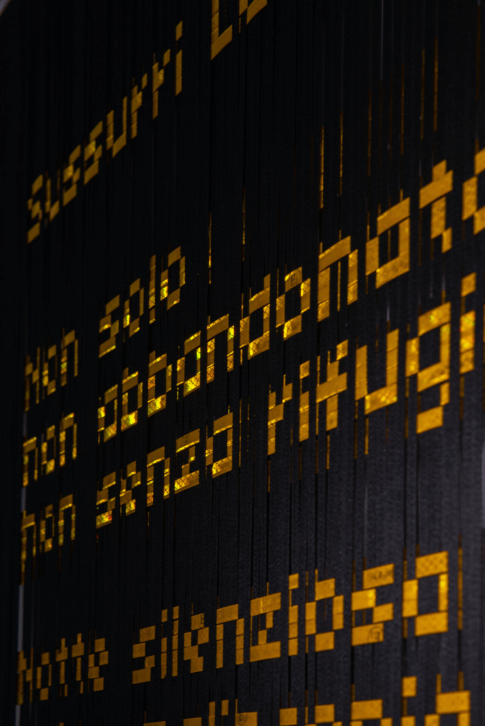 Comprising seven woven panels suspended at various heights within a dim, ecclesiastical space, the installation draws viewers into a transformative state activated through an interplay between darkness and light. Each of the panels is woven from black fabric and high-reflective tape, alluding both to traditional textile practices and to the digital structure of the image. They remain nearly imperceptible until illuminated by a flash, a camera lens, or a directed beam of light. Through brightness, different creatures, emblems, and forms emerge-not as fixed shapes but as fleeting presences hovering on the edge of recognition, quietly asking us to consider what we see, how we see it, and why.