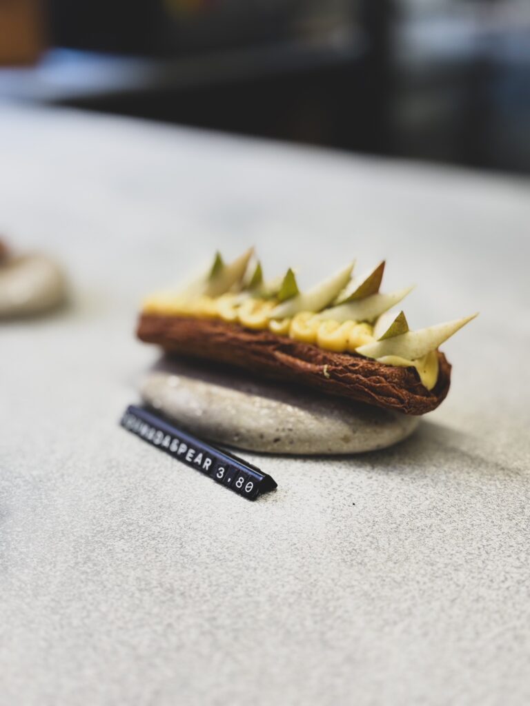 Next to it, the croissant with soumada, almonds, marzipan, lemon verbena and pear – aromatic and balanced, sitting beautifully between sweetness and herbal freshness.