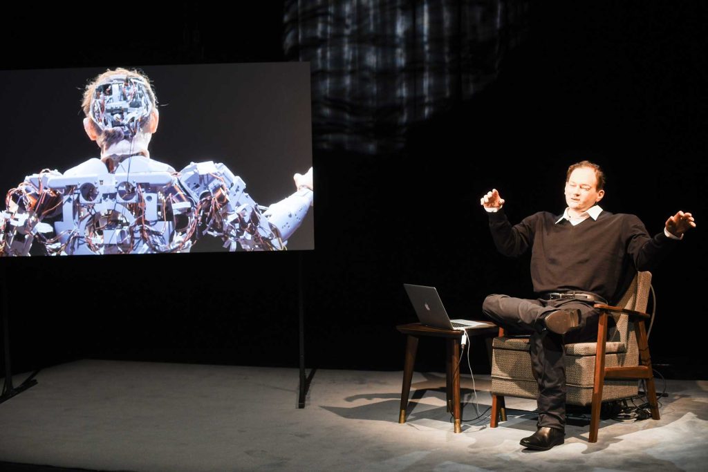 “Uncanny Valley” is a provocative exploration of the fine line between human and machine, directed by Stefan Kaegi. The performance challenges our perceptions of identity and the essence of humanity by introducing an animatronic double of the author and playwright Thomas Melle. As this humanoid takes the author’s place, it prompts deep reflection on the relationship between the original and its electronic counterpart.