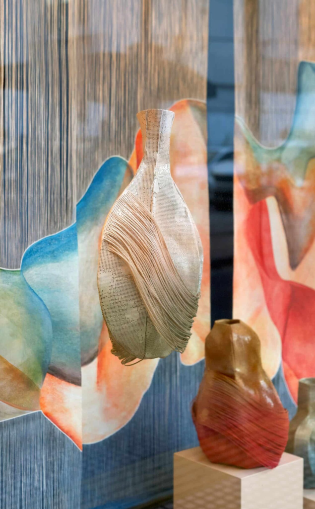 Her work moves between art and design, exploring the transformative possibilities of materials through experimentation with fabric and handmade techniques. Inspired by organic forms and natural textures, she creates textile installations and sculptural textiles that interact with light, transparency and space. From her studio in Athens, she continues to develop projects and collaborations that connect artistic research with contemporary design.