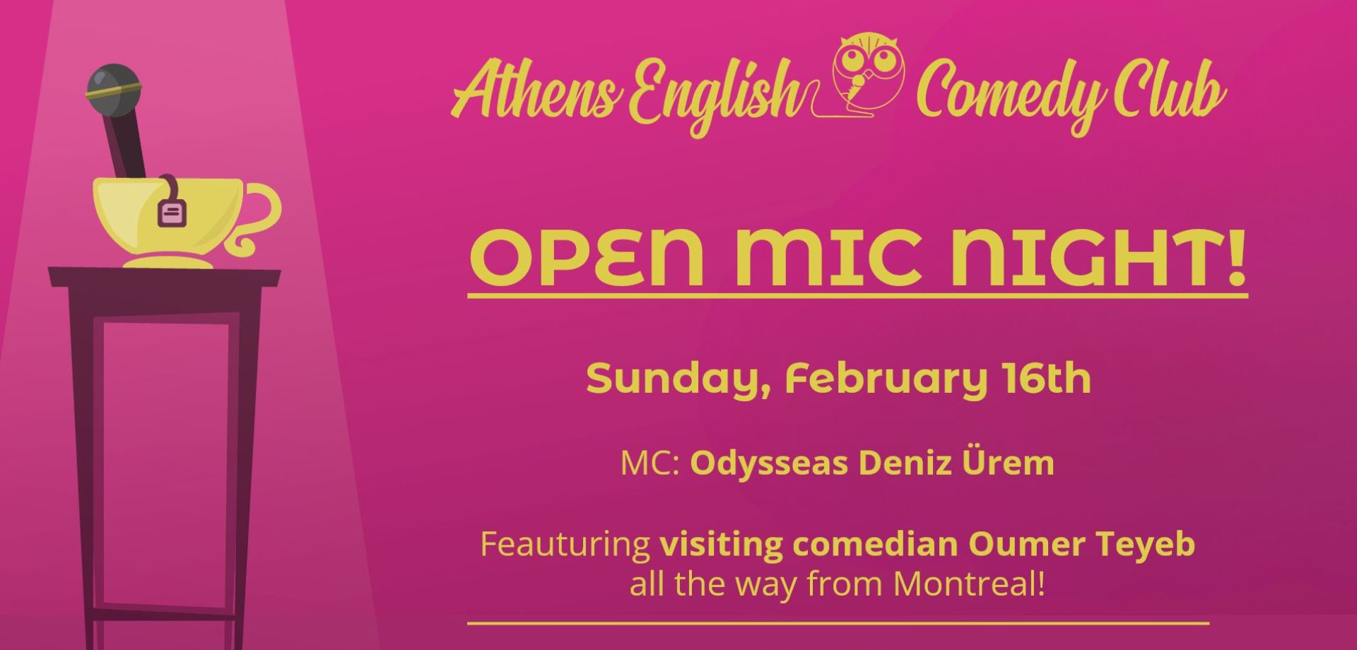Join the Athens English Comedy Club on Sunday, February 16th, for an open mic night! It’ll be a mix of everything. A potluck of comedy. Colourful, comedic, chaos!