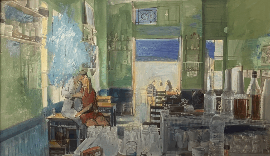 And surely this persistent memory also makes a stop at the bright green café in the market, under Aegina’s old Town Hall, which Samiou painted so many times in a dazzling way, gradually transforming into his own wandering post-neoclassical self-referential geography with intense colors. Gradually, it tenderly blended with his beloved Parisian cafés and symbolically became part of the Athens—or metaphysical—“Café Paradise”, as a sign and part of his personal Mythology forever,” adds the exhibition curator.