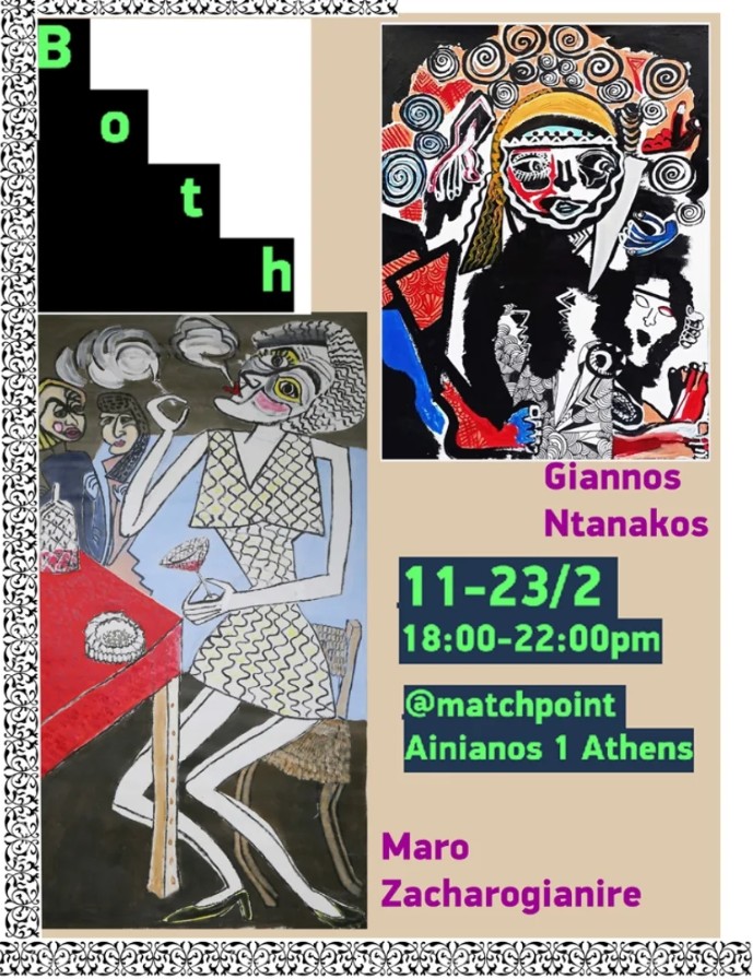 Maro Zacharogianni and Yannos Danakos are expressionist painters. They have similarities and differences. Yannos Danakos follows the flow of writing and the forms unfold through working, guided by the adventure of the material. Maro Zacharogianni, on the other hand, follows a more cerebral process, sketching out her subject in her mind before intervening. Both have a spontaneous approach to a given subject. The writing is characterised by an emotional anxiety, as reality is presented as distorted and contradicts the classical form of representation. Both artists in the exhibition are purely anthropocentric, the vector of their inspiration is the human form, so the paintings presented are portraits and full-length figures.