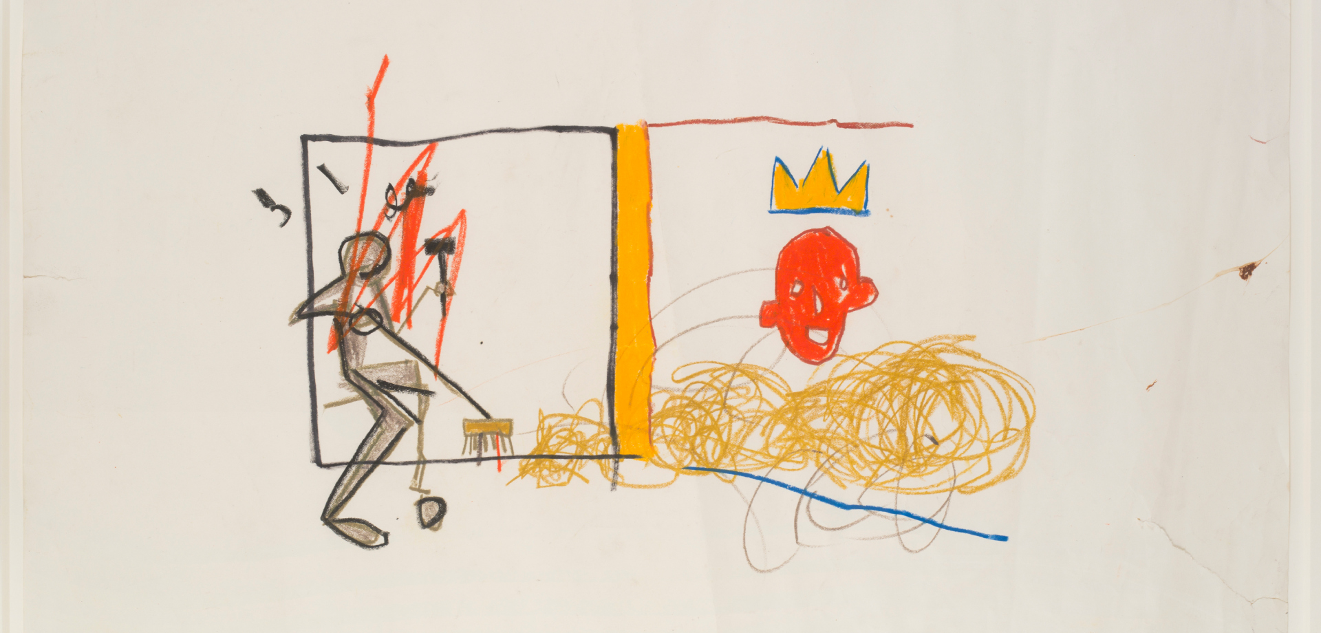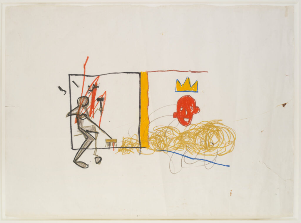 He uses bold brushstrokes, sketches, texts, symbols, hip hop rhymes, and his signature crown—employed obsessively—and connects them in unexpected ways within compositions that exude childlike spontaneity. He always sought to “paint like a child,” yet his aim was to deliver sharp social and political messages.
