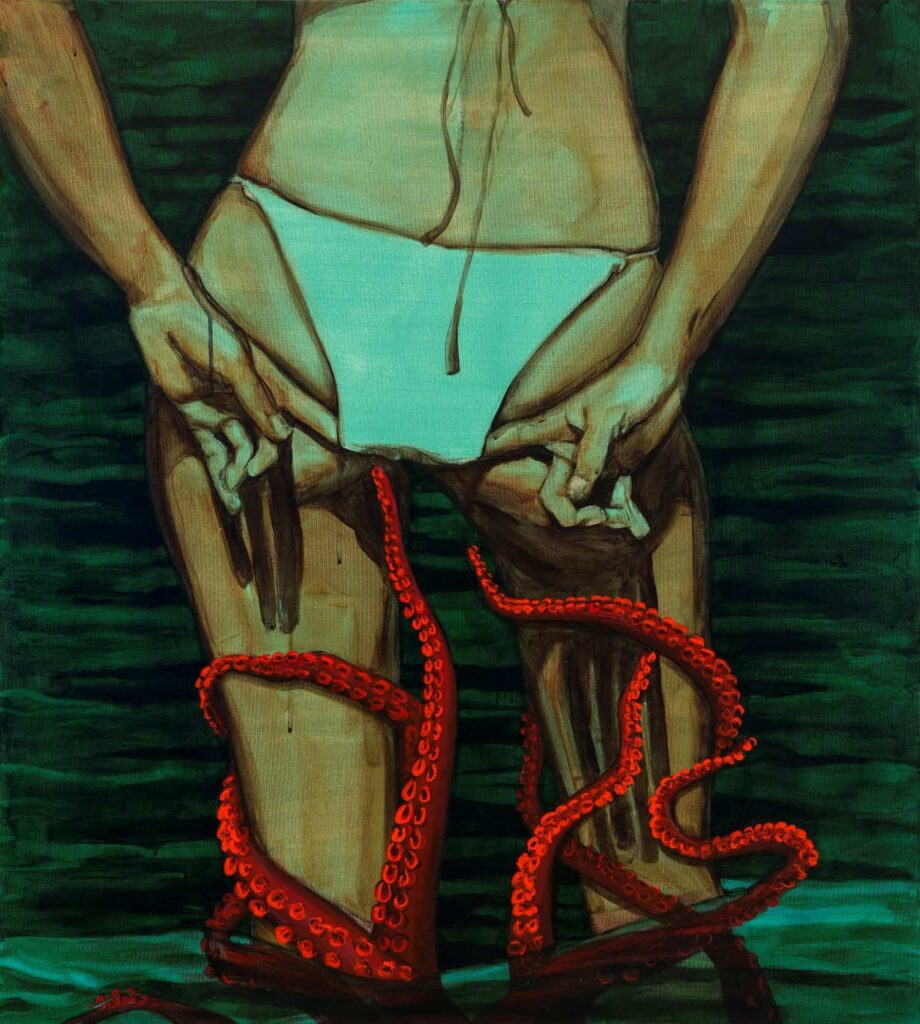 The exhibition maintains a strong feminist character as the artist, for the first time with small-scale works or “naughty miniatures” as she calls them, captures the complexity of the female experience, blending realism with abstraction and symbolism with imaginative compositions. Occasionally, animals appear unexpectedly among human figures, adding depth and complexity to the narrative, while a series of works feature titles inspired by the poetic collection Endepsizika by George Seferis.*