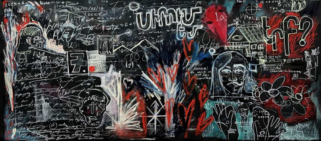 Two contributions come from artists associated with Díla, a community offering mentorship to young refugee women pursuing work in the arts, which co-produced Not Third but Infinite. Upon entering the exhibition, visitors encounter a large-scale painting by Elen Demirian, a young Armenian artist currently studying Visual Arts at Deree. Her striking work 499, co-authored with her partner Aram Minassian-also of Armenian origin and now based in France-is densely layered with references to shared cultural memory, including excerpts from prayers, folk songs, and privately coded numerological symbols, together forming an intimate “third space” on the canvas.