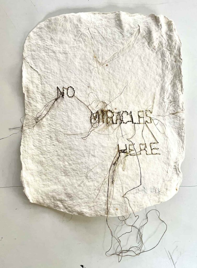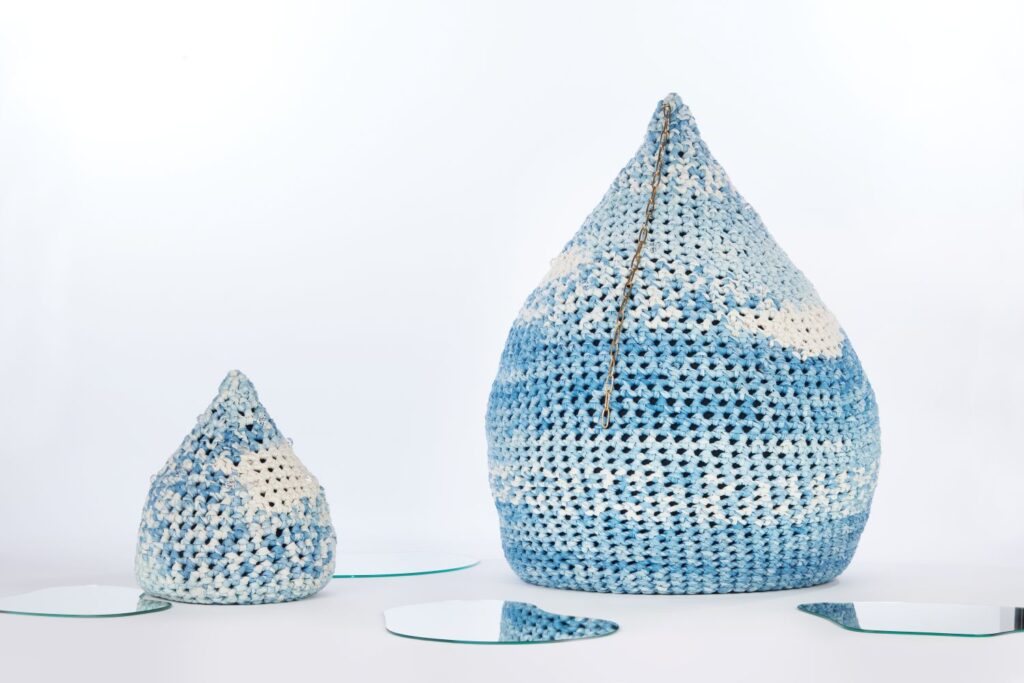 Of Korean-American origin and raised between Switzerland and Greece, multidisciplinary artist Iliodora Margellos brings her meditative stitch-based practice to her series Securities, presenting embroidered aphorisms such as A Star Is Brighter in the Clear Sky and The Sun Will Always Rise as gestures of reassurance for the untethered self. She also presents two lesser-known installations: a floor-based crochet and mirror sculpture of droplets and puddles, titled Long Quiet River, named after Étienne Chatiliez’s French comedy film “La Vie est un Long Fleuve Tranquille”, and a delicate handwoven mobile, Comforts (Very Knotty) IV, anchored by a textile knot that gestures toward entanglement and the quiet inner harmony one learns to cultivate within the layered complexities of familial identity.