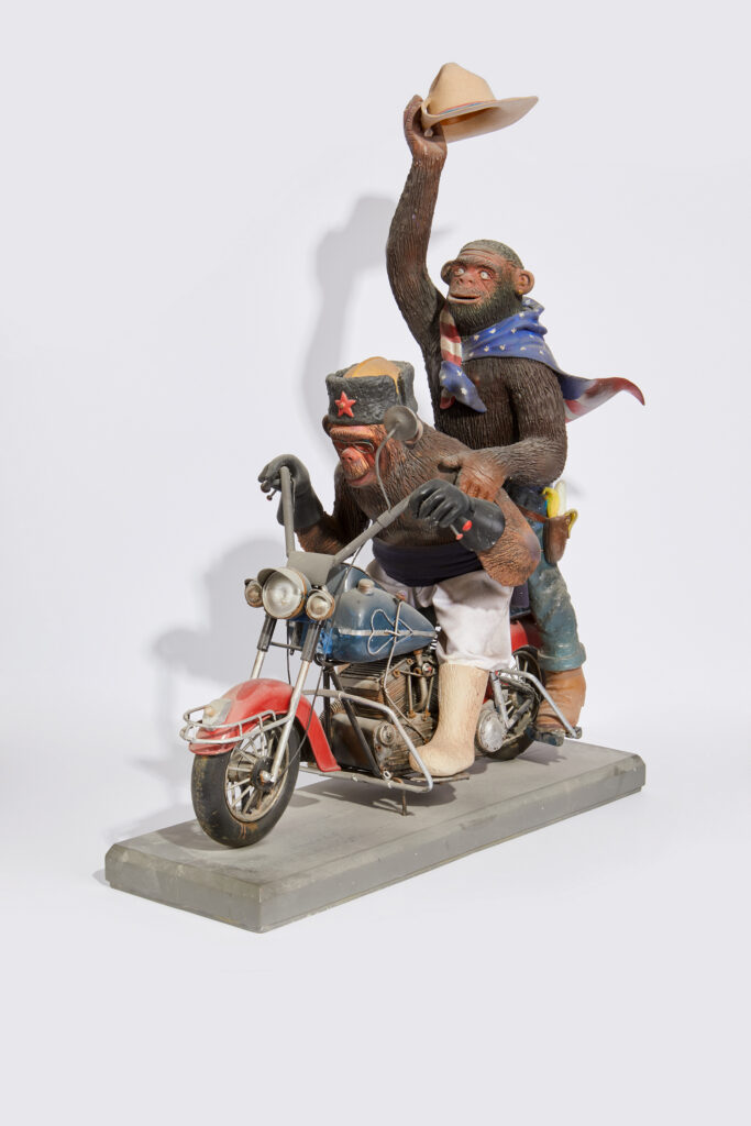 The works as a whole – each of them unique and unnumbered – along with the 15 smaller works of the same series, were created during 2014-2024, along with those of the previous group, titled “Reverse Mythology”. For the artist himself it is a challenge to work with two slip cast ceramic stoneware in an effort to depict the twists in human relationships: “…As time passed by, I saw in my fantasy how people, as they reached their higher level of evolution, begun a gradual return to their primal roots, i.e. the primates – as they are called in the Theory of Evolution by the English physiologist Charles Darwin. A total return to their point of beginning. The special characteristic of this mutation might be that, during their trajectory, they will keep some of the habits they exhibited in their previous lives as Homo Sapiens: their erect walking, as well as some traits of appearance, but mostly their love of technology and machinery. And bikes, in this case, is a lasting symbol of Man’s mechanical evolution”.