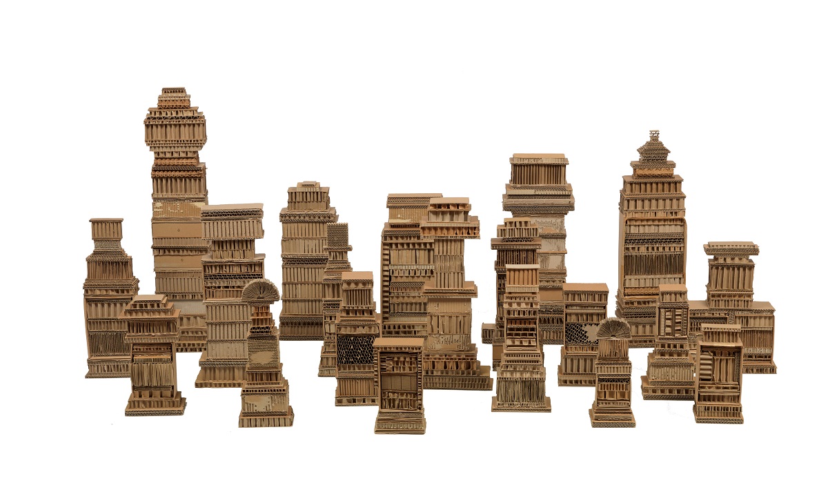 The installation on show consists of sculptures, cardboard structures of various sizes as well as wall-mounted artworks.