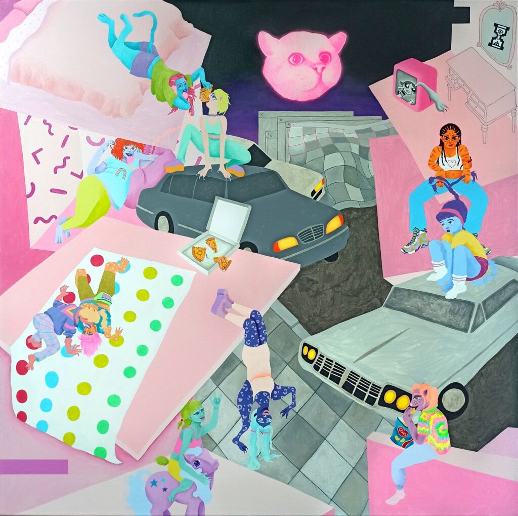 Developing her distinctive style of mixed media painting, Rozaki emerged as a major, idiosyncratic talent among the artists of her generation. Her figurative compositions are masterfully balanced between Quaker formalism and surrealism: rich details of everyday gestures, objects and spaces, references to pop culture and art history, and recurring archetypal feminist iconographic elements are combined with an abundance of sweetness, occasional digital glitches and (sub)conscious thoughts, fears and desires. This bold iconography fully exposes the paradoxes of contemporary life, between libertarian pleasure and neoliberal subjugation.