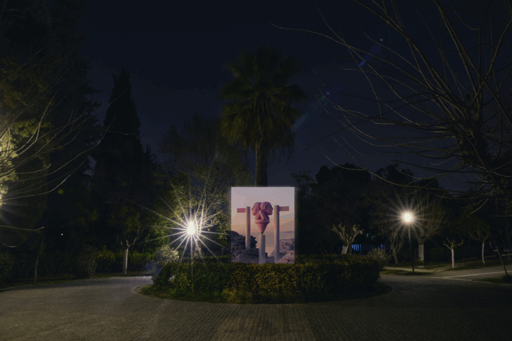 “The paths we followed on this journey began when I gave the initial brief and said: Let’s go with two songs. Let’s go with ‘Tell me lies, tell me sweet little lies,’ and ‘Personally, I can’t tell if what we’re living is real or a hallucination.’ That was our starting point. So then we asked: Where do we place this illusion? As we looked at the artworks we loved, and thought about our own personal illusions—about living in Greece, about who we are—we found ourselves drawn to this game with archaeology. A game I eventually called pseudo-archaeology. Works that seem ancient, but aren’t. From afar, you might think Angelidakis’ columns are ancient ruins, or that the Parthenon created by Callas had always been there.”