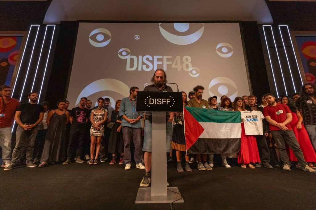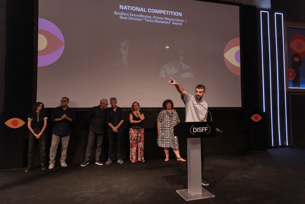 Before the speeches began, in a surprise move, the short filmmakers collectively climbed on stage and raised the flag of Palestine, while actor Antonis Tsiotsiopoulos read a statement about the Greek vessel Oxygen, “which leaves the port of Hermoupolis to join the international fleet heading to Gaza, carrying hope, life, and humanitarian aid.”