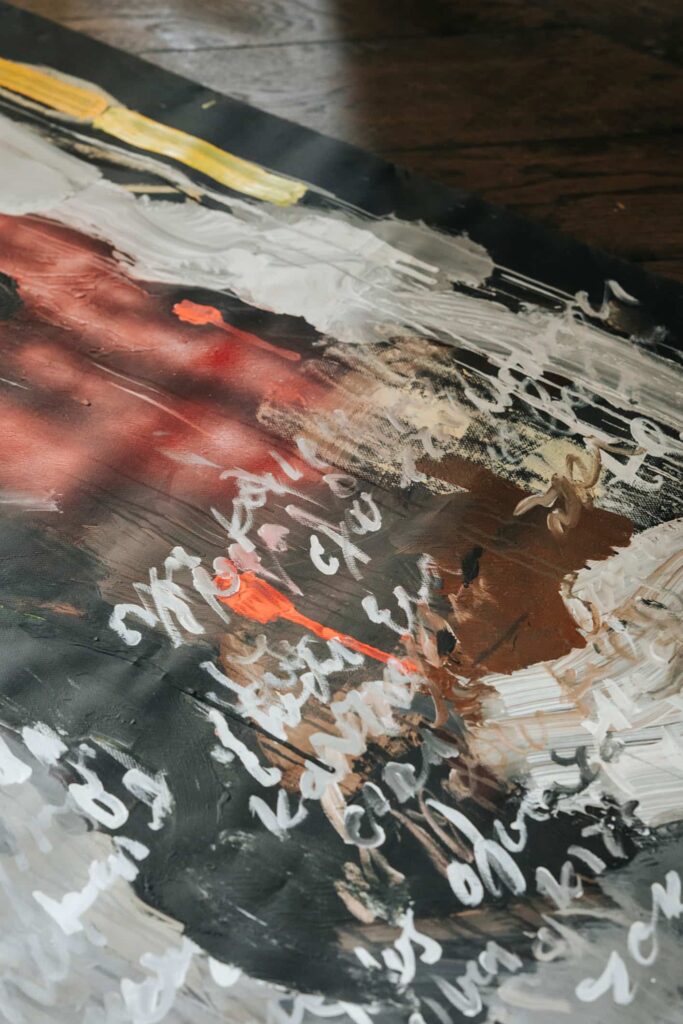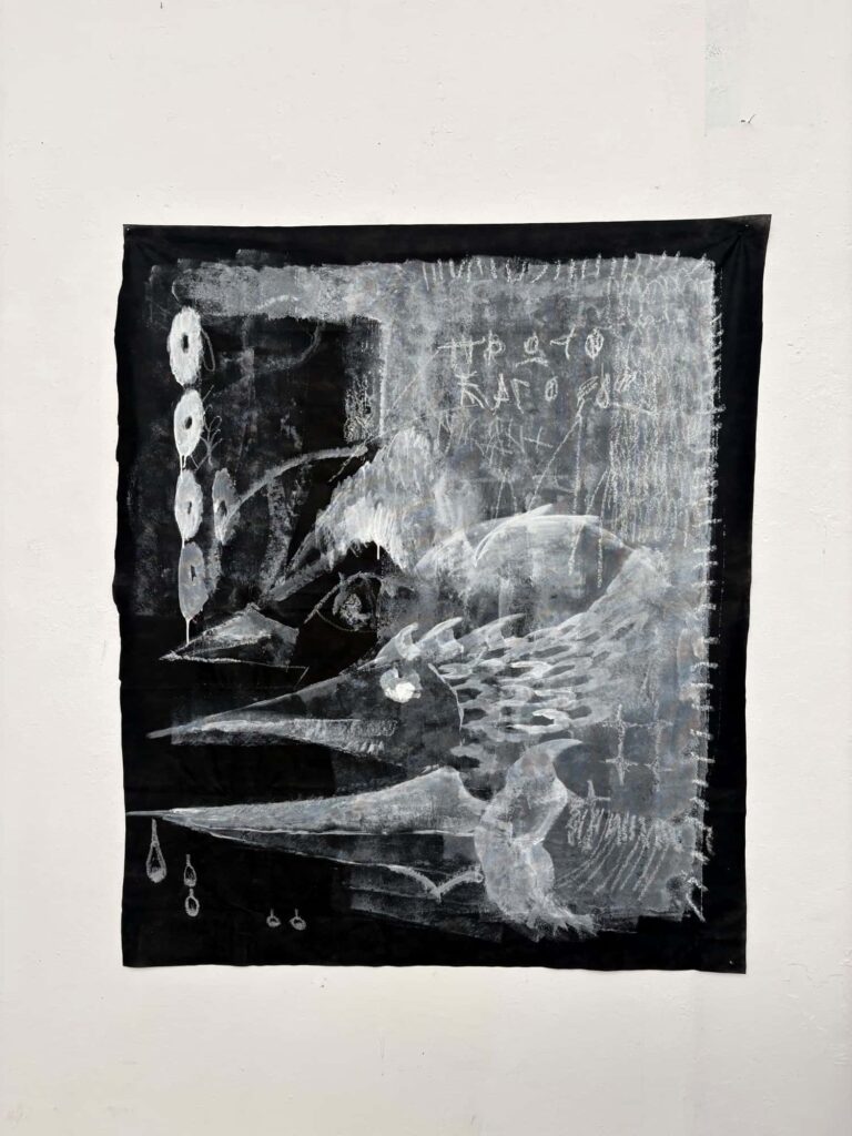 Stamatelos employs a rich and explosive visual language. Influenced by street art and its gestures, he develops a painting practice with strong performative qualities. In his works, stains and forms intertwine across canvases made from advertising banners and packaging materials, activating a continuous recycling of matter and meaning. His practice draws from the semiotic density of the urban landscape, which he processes through a raw, almost automatic mark-making. The result is a series of abstract fields that bear traces of human action, maintaining the intensity and immediacy of gesture.