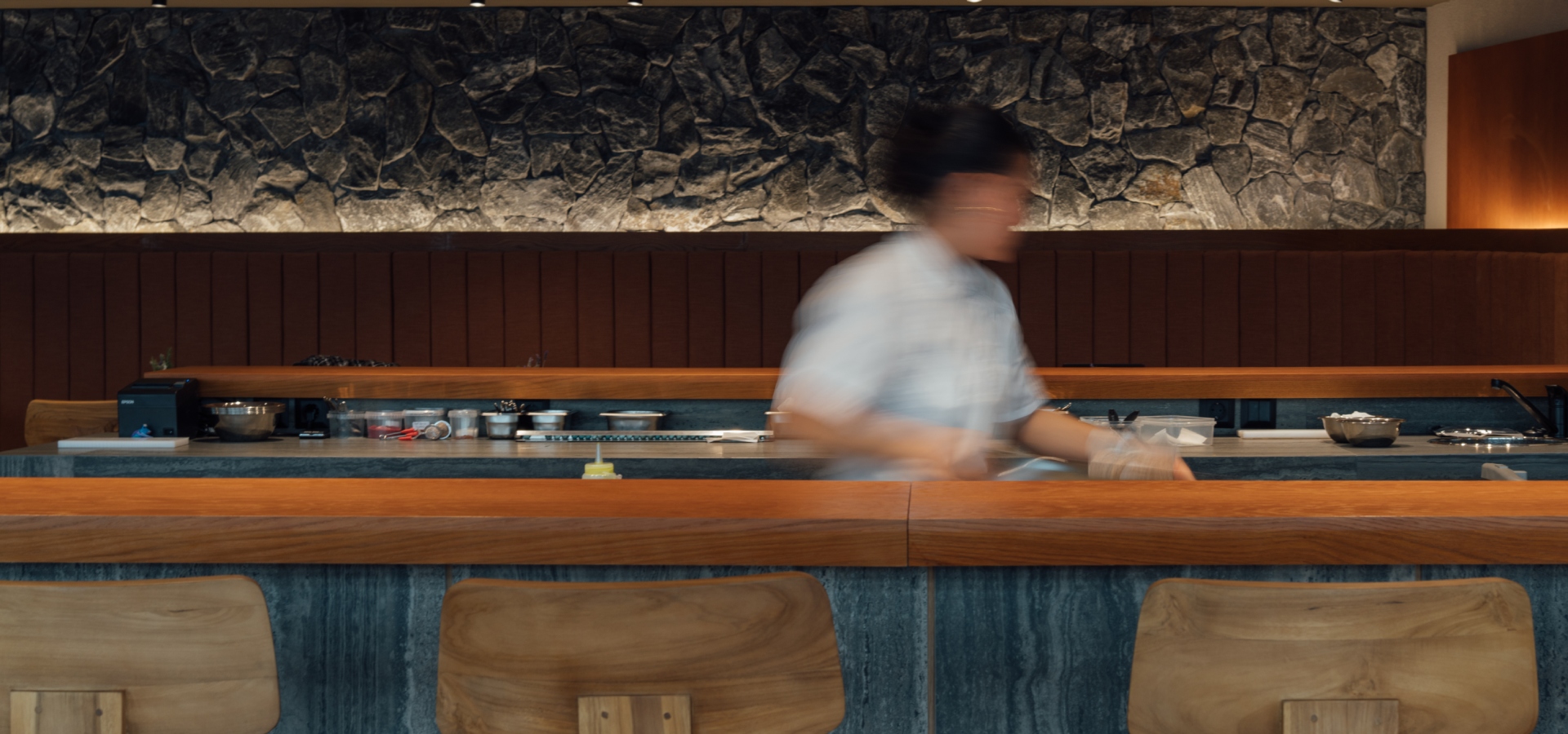 The open kitchen brings the creative process to the forefront, transforming cooking into part of the experience itself. Dishes are served on custom ceramics by MudLab, designed exclusively for Amphibian, while the overall journey is completed with gastronomic cocktails and a contemporary wine list that moves freely across different expressions of terroir – from precise, clean winemaking to more vibrant, spontaneous fermentations.