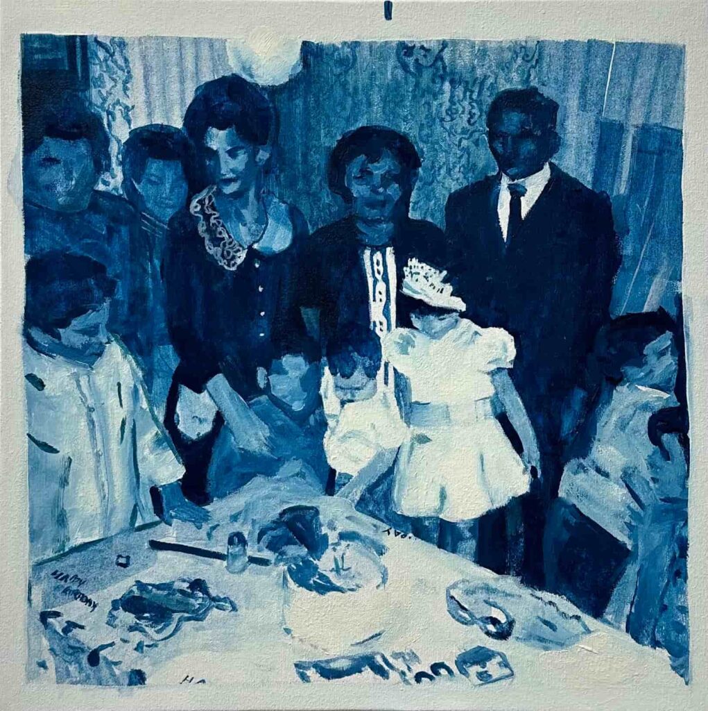 The two large-scale paintings, Birthday Confetti and Fruit Agora as well as the grid of twelve smaller canvases entitled Birthday Blue evoke objects of remembrance, ensuring they are not forgotten by the part of the family that stayed home. This composition can also be interpreted as a symbol of achievement, representing the resilience that required to leave home.